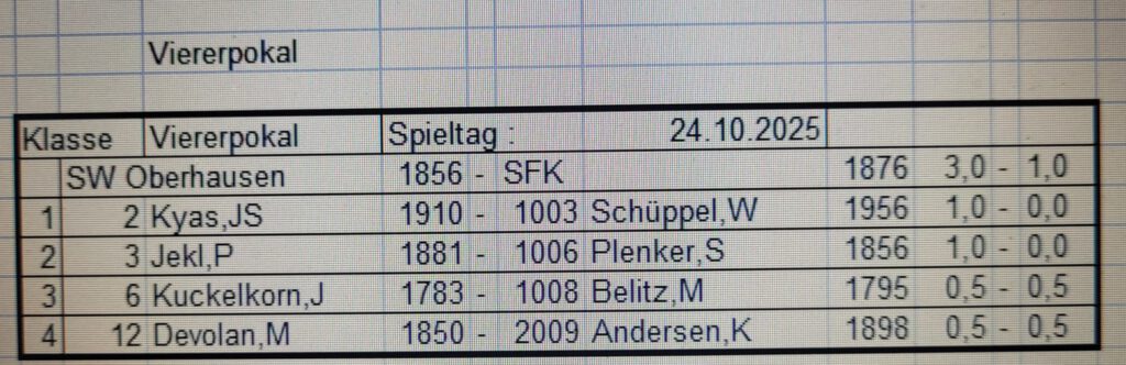 Mit einer deutlichen 1:3 Niederlage gegen das schwächer eingeschätzte Team von SW Oberhausen sind die Schachfreunde im Viererpokal ausgeschieden.