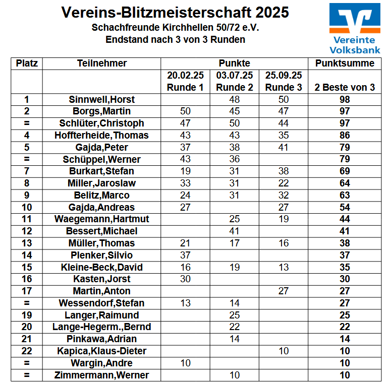 Mit einem starken Sieg in der letzten Runde konnte sich Horst Sinnwell an den leicht favorisierten Martin Borgs und Christoph Schlüter noch vorbeiziehen und wurde ein weiteres Mal zum besten Blitzspieler der Schachfreunde gekürt.